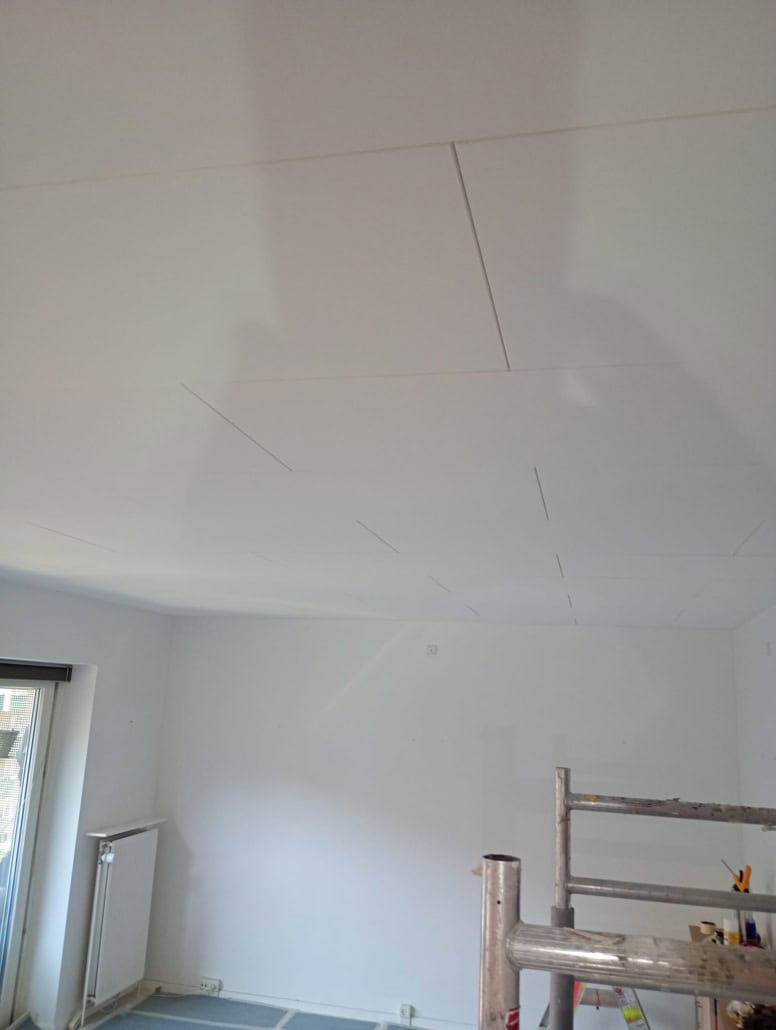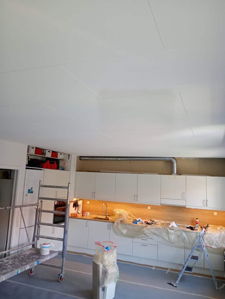 I dette rum ønskede kunden en bedre akustik, og at det kunne integreres i deres nye tilsætninger i køkkenet. For at skabe en så naturlig overgang så muligt blev der fuget mellem loft og vægge. Efter det var opsat bemærkede kunden at de snildt kunne have en uforstyrret samtale, mens radioen kørte, det kunne de ikke tidligere.