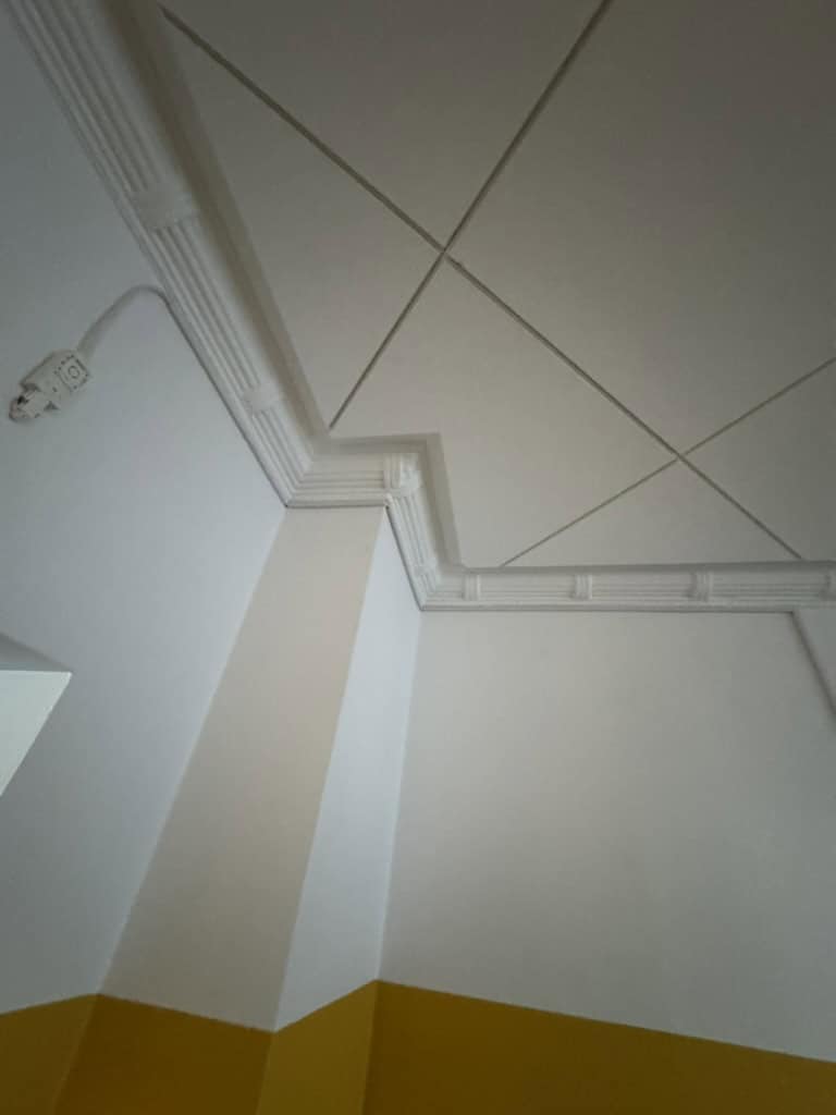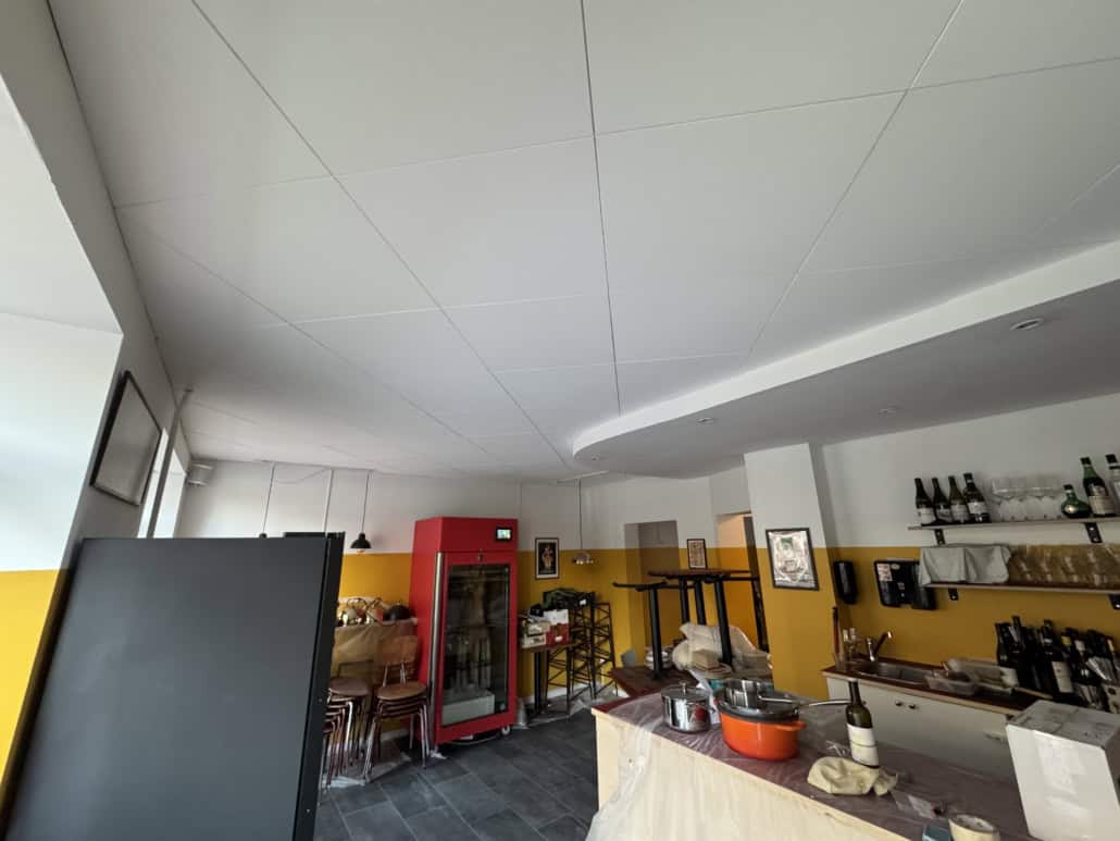 I de næste rum var der stuk og gamle pudsede lofter, så her ønskede kunden at bevare udtrykket og samtidigt lukke af for støj mod/fra overboen. Her valgte vi en plade med E kant (mellemrum) og limede det op diagonalt på rummet for at simulere et gammelt apoteker/cafe loft i mat glas. Udtrykket passer godt sammen med stuk, og der blev både skabt en reduktion af lyd til og fra overbo og en bedre rumklang i rummet.