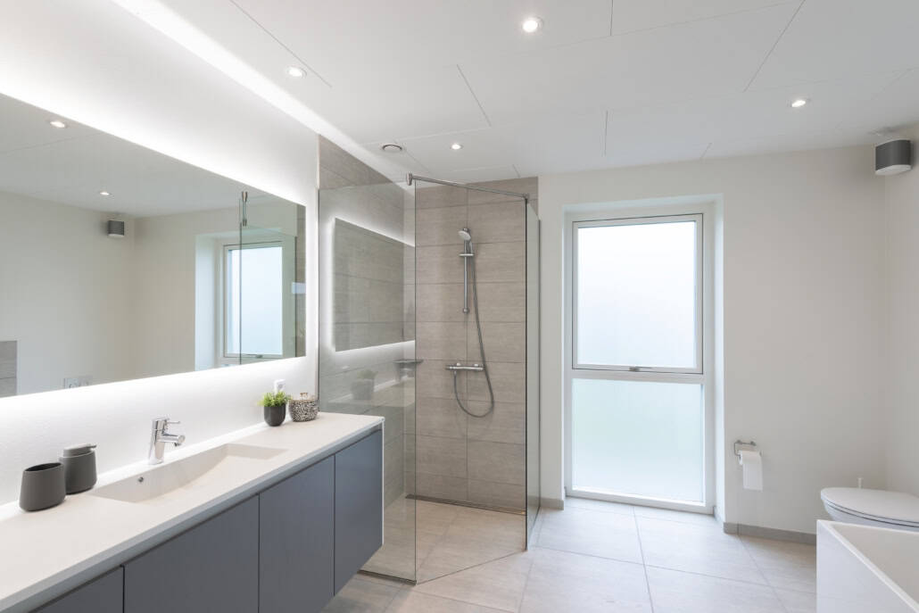 Nogle foretrækker den forstærkende effekt når der synges i badet, andre vil gerne have mere ro når flere er i badeværelset på én gang. Her er benyttet Blanka med sin meget hvide overflade og som også er let at aftørre.