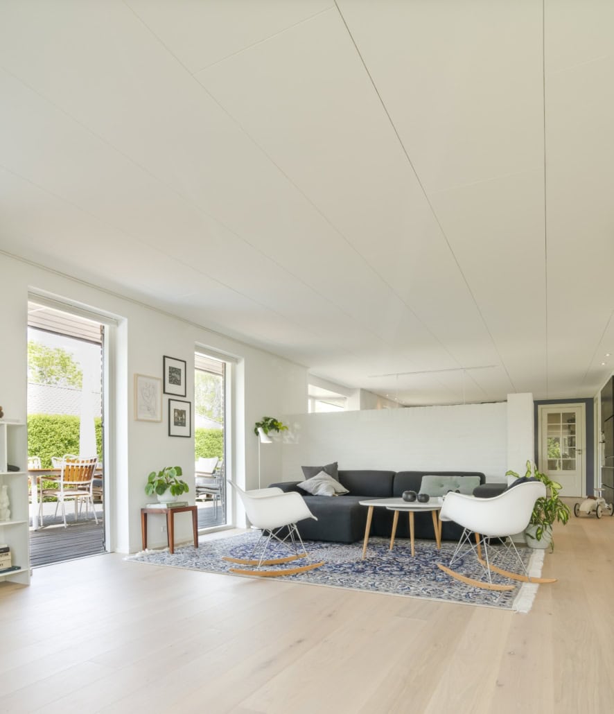 I de fleste nye lejligheder og boliger ynder vi at indrette køkken som et samlingssted, et leverum, hvor mange fælles aktiviteter foregår. Koge, eller køkkenøen er stedet vi samles op, hvad enten det er madlavning, lektier, arbejde eller en sludder med venner. Det er disse type rum vi hyppigst skal lave akustikløsninger til. Siden Corona og en større åbenhed overfor at arbejdet også kan udføres hjemmefra, har vi behov for et rum, hvor der kan tales i telefon, eller mødes online uden at skulle lukke ned for resten af familiens gøremål. Et akustikloft i disse rum er nærmest en gamechanger, og hver gang vi laver disse lofter bliver vi nærmest mødt; ”Hvordan har vi kunne leve uden, det gør en kæmpe forskel”.