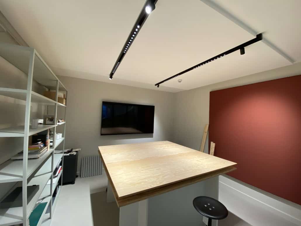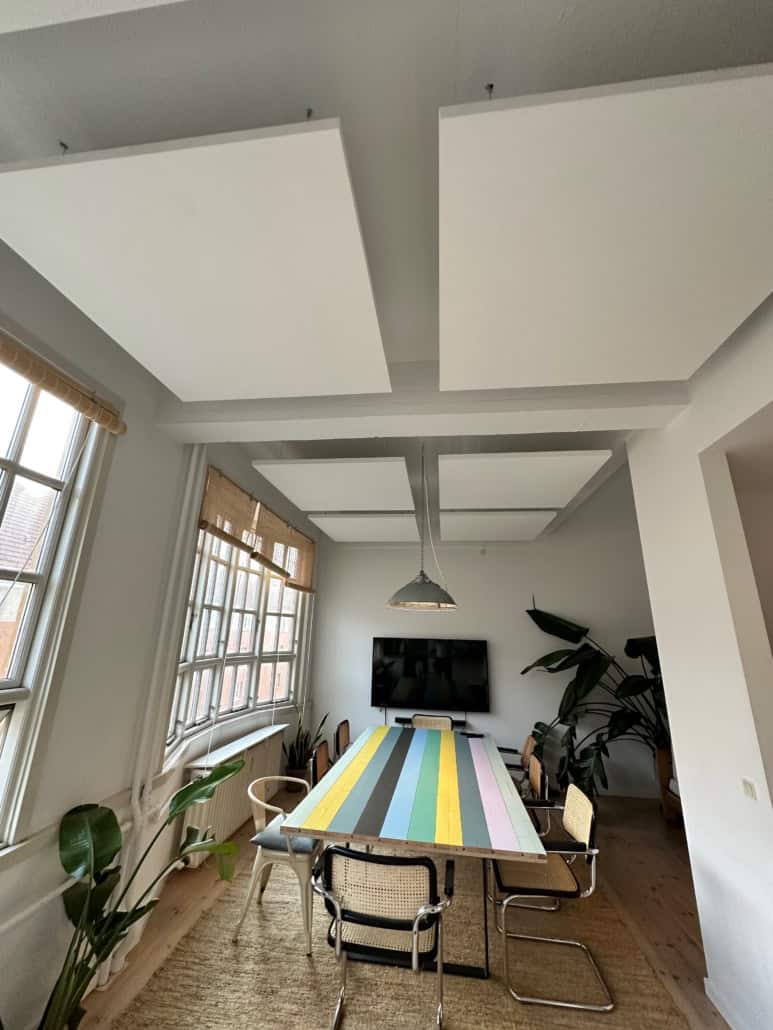 Her var det et møderum hvor der var begrænset loftshøjde, og samtidigt ønskede man at integrere lysskinner i loftet. Resultatet er et funktionelt, flot og effektivt akustik loft.