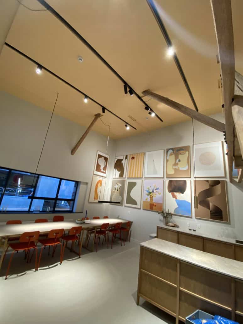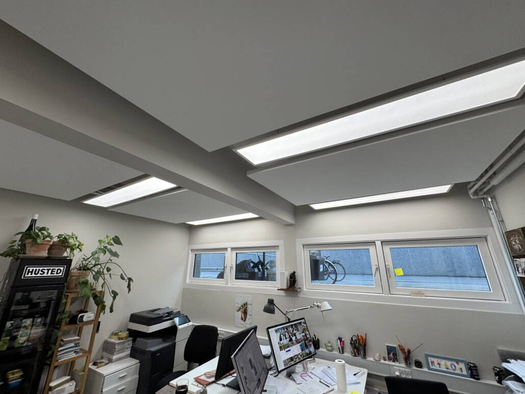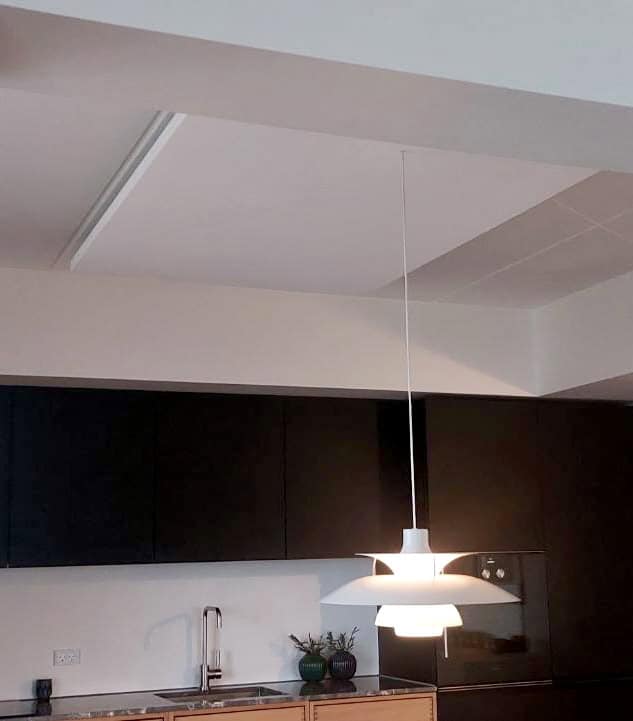 I dette tilfælde har vi monteret standard Eclipse flåder i wires som er nedhængt så det passer ind i elementerne, så det ligner en naturlig højde. Samtidigt er de tilskåret så de passer med rummets former. Resultatet er et let loft som er super effektivt.
