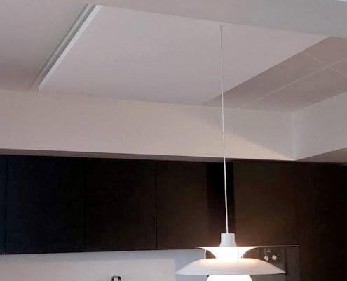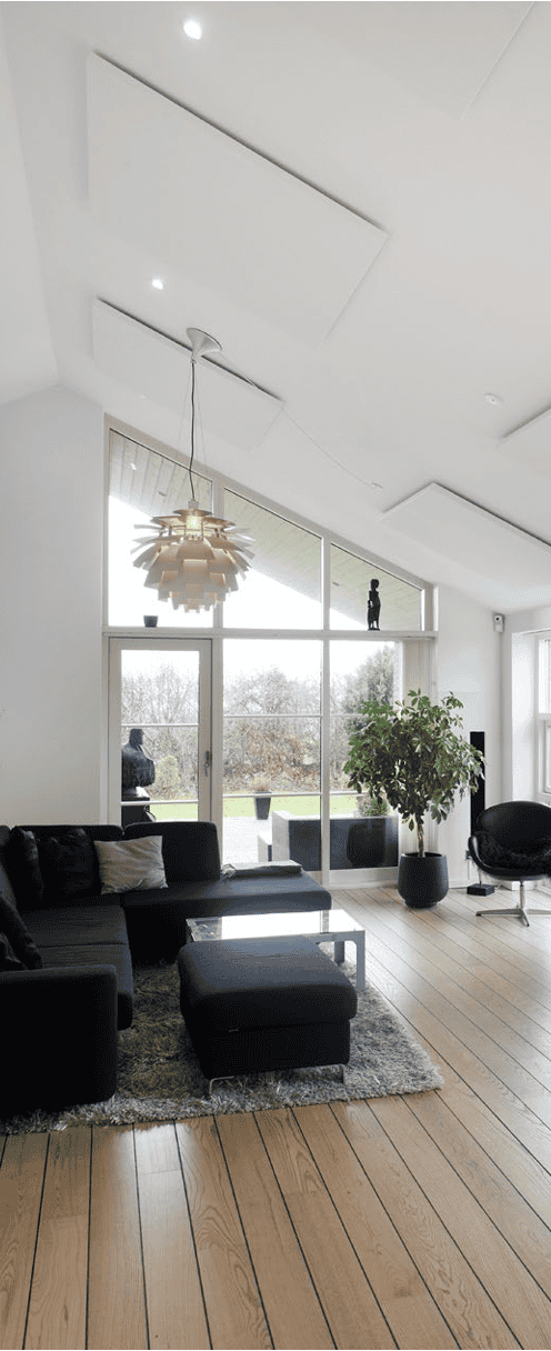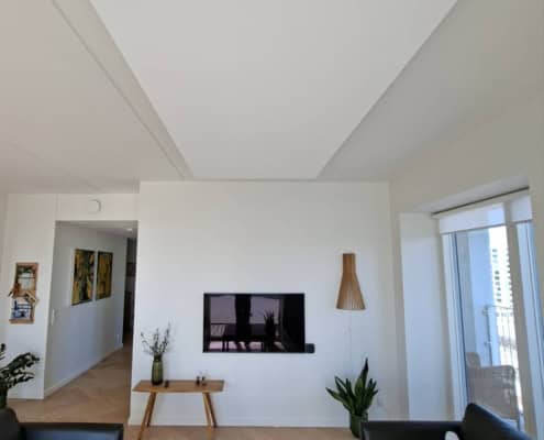 Her er der meget højt til loftet, men samtidigt et glasparti (ses ikke) hvor vinduerne går helt op til loftet. Derfor ønskede kunden at Eclipse flåderne skulle monteres direkte i loftet og placeres så der kunne monteres lysskinner imellem pladerne.