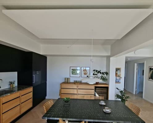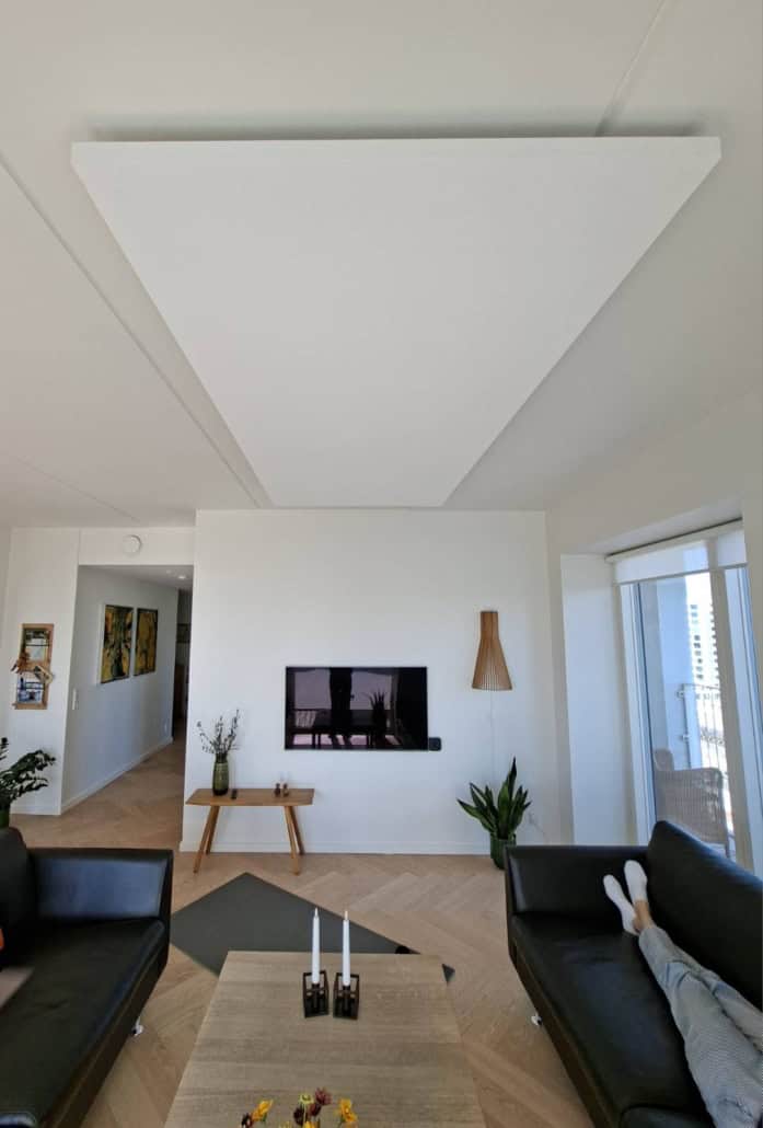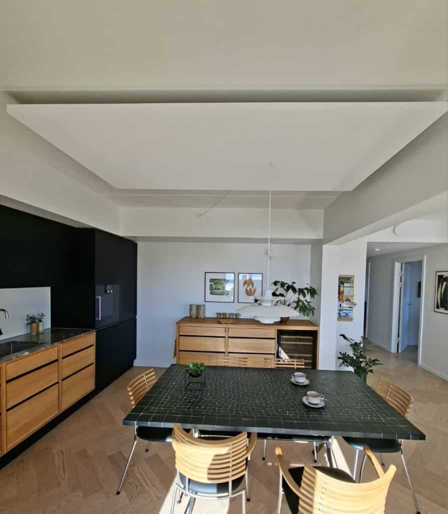 Mange af de nye byggerier i København, hvad enten de er beklædt med mursten eller anden beklædning er under dette i bund og grund en betonkonstruktion. Dette ses ved samlingerne af betonelementerne i lofterne, typisk med lampeudtag på væggene. Det høres også og i forhold til gamle pudsede lofter eller endda et gipsloft giver disse lofter den højeste rumklang, eller støj som sendes tilbage. Hvis man enten bor til leje, ikke har mod på en større renovering, eller ikke ønsker denne slags investering, kan flåde løsningen være ganske effektiv. Alt som absorberer rumklang vil gøre en forskel, og flåderne kan placeres der hvor støjen/lyden genereres. I dette tilfælde en lejlighed på Islands Brygge hvor det typisk var i spisekøkkenet eller i sofagruppen at der var udfordringer med støj.